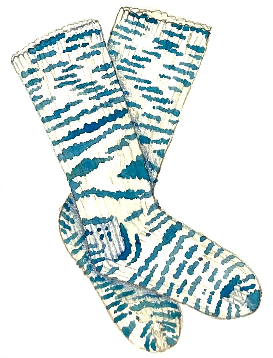 [2] After the cuff, I decreased a set number of stitches toward the ankle. Colorful space-dyed yarn I knit in stockinette stitch and solid colors I adapted designs from Barbara Walker’s Treasury of Knitting Patterns. At the top of the heel, I divided stitches in half, knit slip one/knit one for the heel on one half, picked up gusset stitches, and continued to knit around for the length of my foot (sometimes this involved decreases). I varied toe shaping for variety.